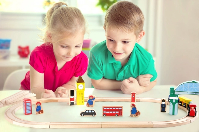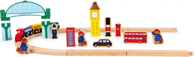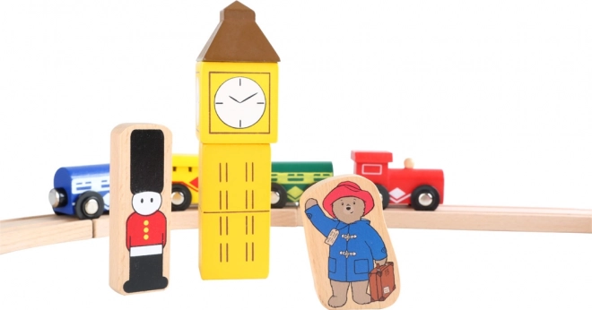 Setul include piese din lemn detaliate cu Big Ben, cabina telefonică roșie, autobuzul etajat și figurine – ideale pentru povești tematice cu PADDINGTON.