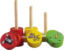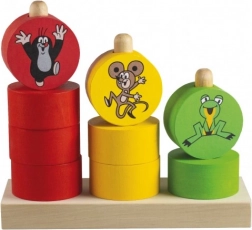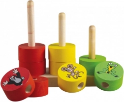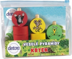 Piramide vesele Krtek oferă copiilor o oportunitate excelentă de a-și dezvolta motricitatea fină și creativitatea. Trei tije colorate și 12 piese care se pot înșira cu motive vesele vor atrage orice copil. Produsul este realizat din lemn de calitate, garantând o construcție tradițională și durabilă.