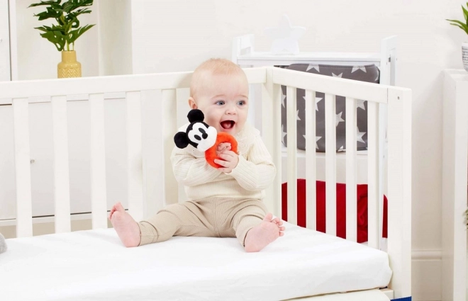 Zornăitoarea de pluș MICKEY MOUSE, în îndrăgita combinație alb-negru-roșu, este un companion grozav pentru primele descoperiri ale lumii. Materialele moi sunt plăcute la atingere, iar zornăitul discret motivează copilul să se miște, să agite și să exploreze.