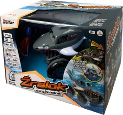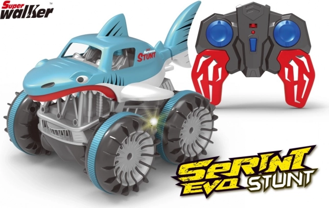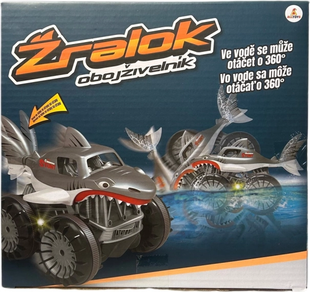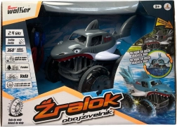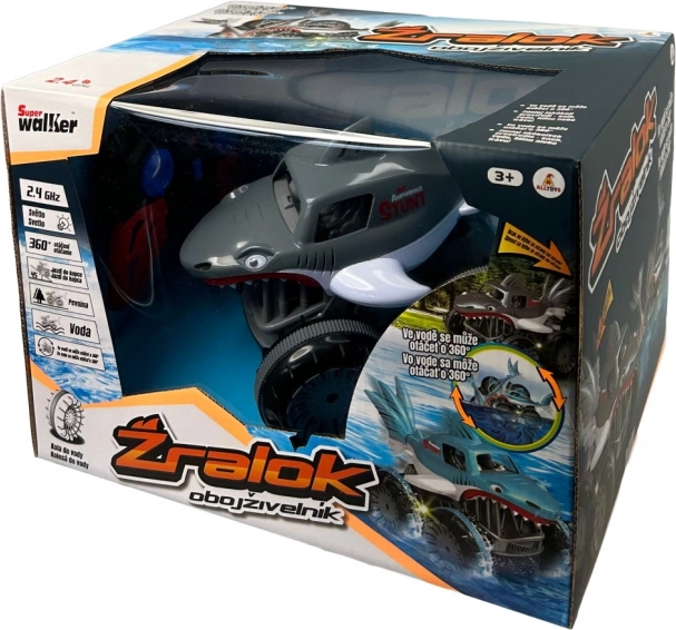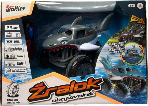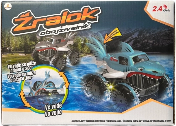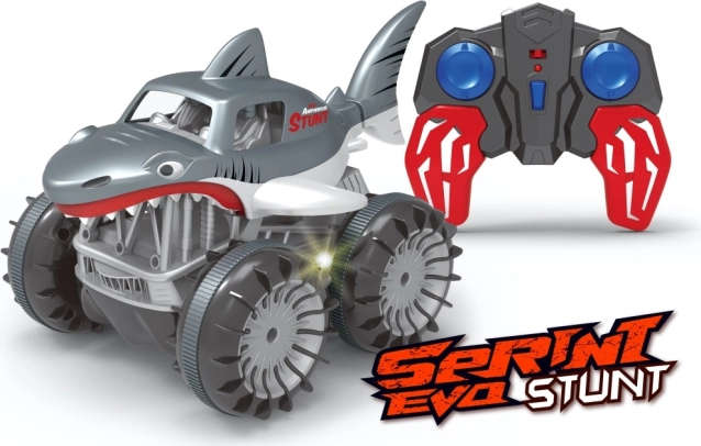 Trăiește adrenalina cu rechinul RC amfibiu, care face față zăpezii, apei, noroiului și ierbii. În apă poate realiza rotații de 360°, atinge viteze de până la 7,5 km/h, iar datorită controlului pe 2,4 GHz are o rază stabilă de până la 20 m.