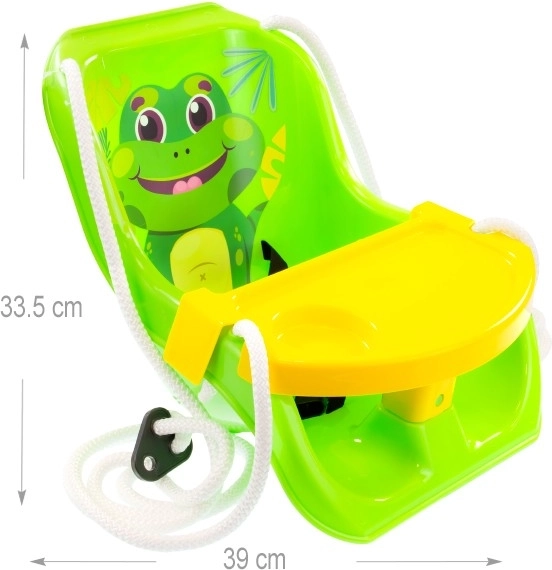 Leagăn practic și distractiv pentru cei mici, cu motiv de broască, oferă modul 2‑în‑1 – cu bară frontală de siguranță pentru copiii mici și posibilitatea utilizării ulterioare fără bară. Este realizat din plastic de calitate și sigur și are protecție fermă împotriva căderii, astfel încât copiii se pot legăna confortabil și în siguranță acasă sau în grădină.