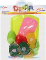 Jucărie de bucătărie distractivă pentru micii bucătari: set pentru tăierea fructelor cu piese din plastic sigure și o tavă practică. Susține motricitatea fină, coordonarea mână–ochi și imaginația ludică fără risc de rănire.