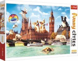 - Puzzle-ul conține un colaj de imagini cu câini de diverse rase în peisajul Londrei, ușor de recunoscut.