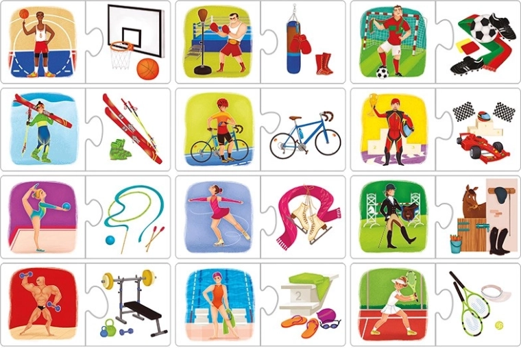 Descoperiți un joc educativ distractiv sub formă de puzzle, care le prezintă copiilor de la 3 ani lumea sportului. Setul conține 24 de piese pentru a crea 12 perechi de sportivi și echipamentele lor. Susține motricitatea fină, coordonarea mână–ochi și abilitățile de observare. Datorită ilustrațiilor colorate, copiii vor învăța cu ușurință diferite sporturi și atributele acestora. Potrivit pentru 1–2 jucători, ideal pentru joacă alături de părinți sau prieteni.