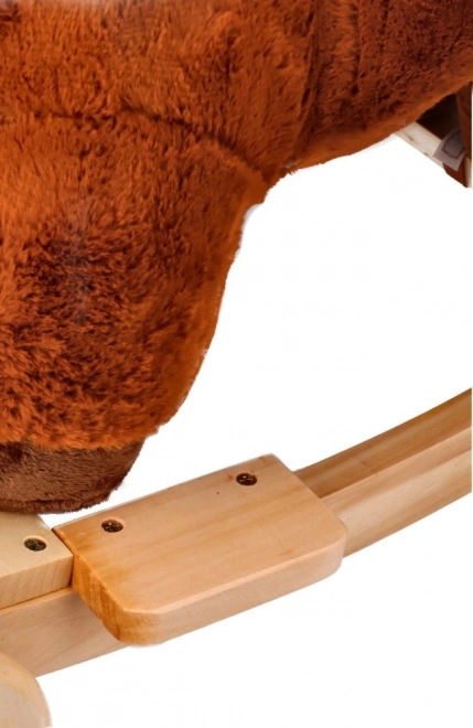 Căluțul de lemn are un scaun moale care asigură confortul și siguranța copilului în timpul jocului.