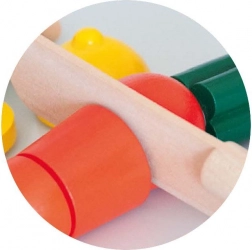 Setul WOODY distractiv și interactiv pentru micii bucătari conține o tăbliță din lemn, cuțit și 12 piese de fructe și legume, care pot fi tăiate în siguranță datorită scaiului.