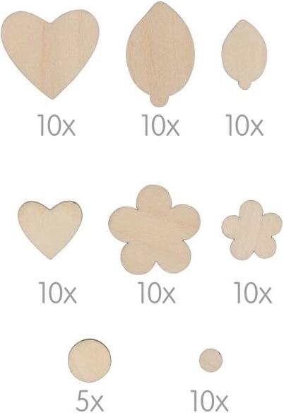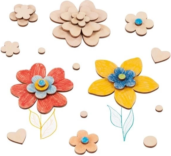 Cu acest set variat de felii din lemn în formă de floricele vei crea decorațiuni originale, felicitări, tablouri și ornamente de sezon. Piesele, cu dimensiuni între 7 și 32 mm, se lipesc, se combină și se colorează ușor, astfel încât copiii își pot dezvolta imaginația și îndemânarea.