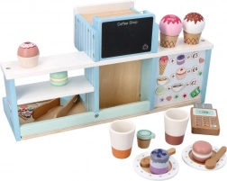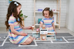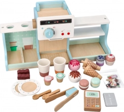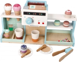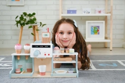 Această gelaterie și cafenea din lemn oferă copiilor o experiență autentică de servire într-un mic bistro. Datorită accesoriilor colorate, butoanelor rotative și elementelor realiste ale espressorului și standului de înghețată, copiii își exersează motricitatea fină, comunicarea și imaginația.