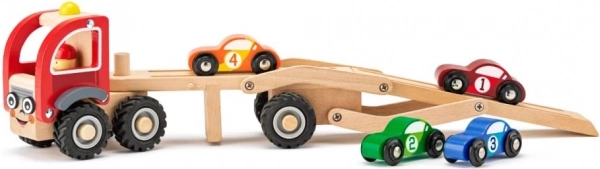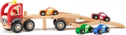 Setul conţine cap tractor cu rampă şi patru maşinuţe colorate, care pot fi încărcate şi descărcate după dorinţă. Roţile din cauciuc ale transportorului garantează o mişcare silenţioasă şi lină pe podea, iar dimensiunile compacte se potrivesc bine şi mâinilor mai mici.