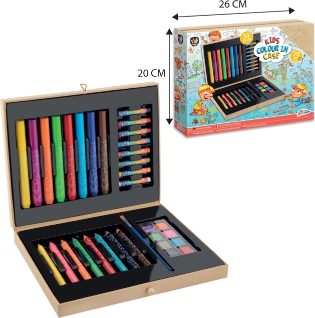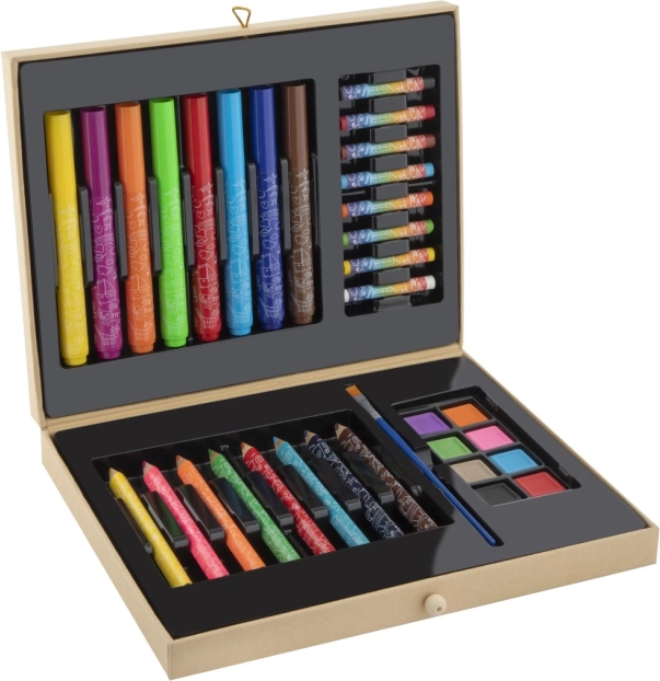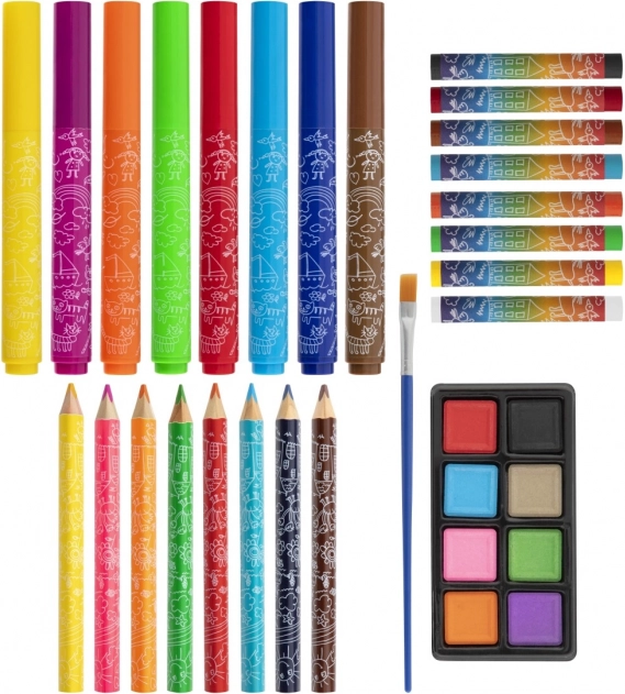 Setul de 33 de piese oferă o paletă largă de culori și instrumente pentru pictură, desen și colorat – ideal pentru artiștii începători.