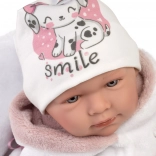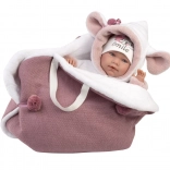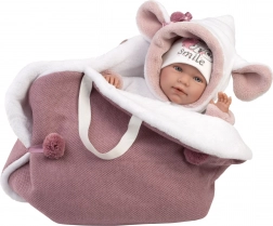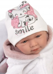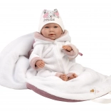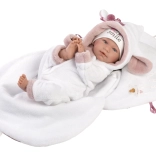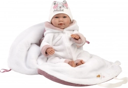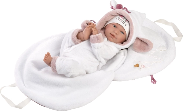 Bebeluș vorbitor cu corp moale din material textil, care, atunci când este apăsat pe piept, începe să spună „mama”, „papa” și scoate sunete reale de bebeluș care plânge. Mâinile și picioarele sunt prinse de corp cu articulații. Bebelușul este poziționabil și poate sta și în șezut. Suzeta din pachet servește doar ca accesoriu. Dimensiune 42 cm. Realizat manual în Spania, ambalat în cutie cadou. Vârsta recomandată: de la 3 ani. Pentru bebeluș se pot achiziționa separat haine originale suplimentare din oferta Llorens pentru bebeluși NEW BORN, mărimea 40-42 cm sau 43-45 cm. Pachetul include 3 baterii tip buton LR44, împreună cu instrucțiuni pentru înlocuirea lor. Bateriile sunt consumabile, prin urmare descărcarea lor nu constituie motiv de reclamație pentru păpușă.