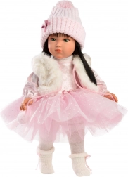 Include o pălărie roz stilată, vestă albă și fustă cu buline, ideală pentru jocurile de iarnă.