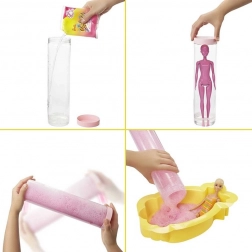 - Turnați soluția spumoasă în tubul inclus - spuma parfumată va dezvălui păpușa Barbie Color Reveal!