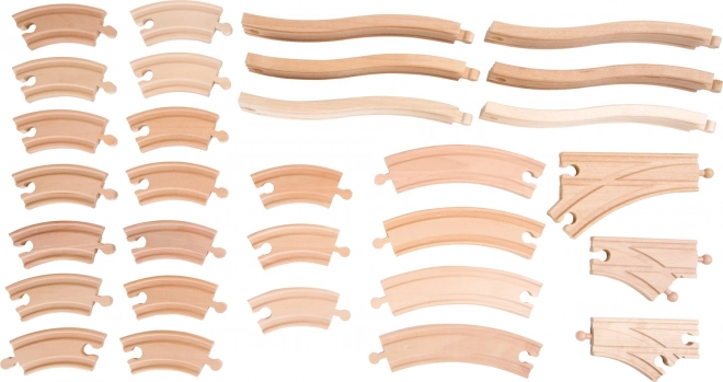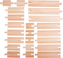 Prelucrarea de calitate a șinelor din lemn asigură o joacă sigură și ușor de asamblat diverse trasee feroviare.