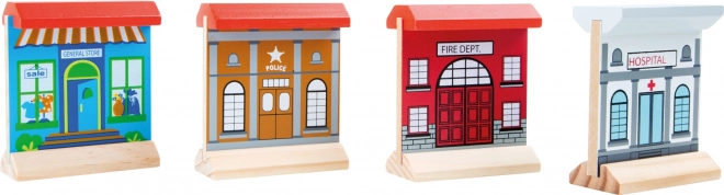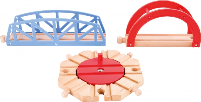 - Copaci, diverse clădiri din lemn și locomotive și vagoane colorate pentru completarea lumii feroviare a copiilor.