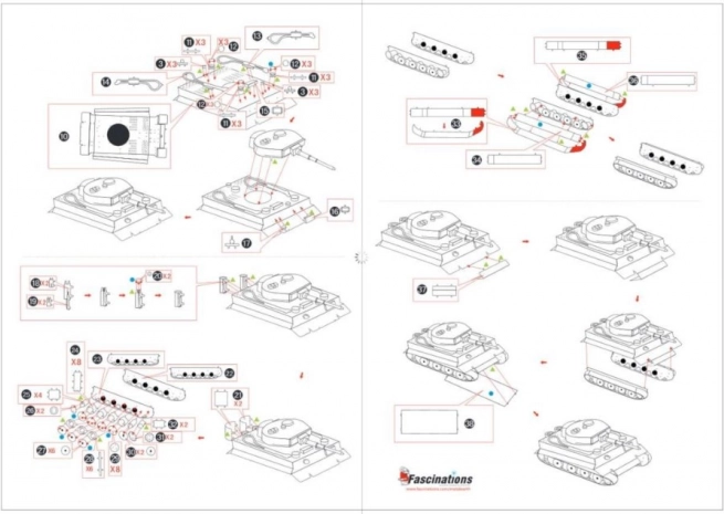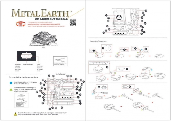 Scoateți piesele individuale din foile metalice; dacă este necesar, folosiți clești tăietori mici (neincluși). Piesele se îmbină folosind sisteme de prindere formate din cârlige (lăbuțe) și orificii. Îndoiți lăbuța cu ajutorul unei perechi de clești subțiri mici (neincluși) și îmbinați pe rând toate prinderile până când obțineți o piesă de rezistență foarte realistă!