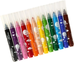 Carioci sigure și distractive pentru cei mai mici, de la 1 an: vârf blocat de 5 mm rezistent la presiune, cerneală lavabilă de pe piele și textile și 12 culori intense, cu capac ventilat, pentru creație fără griji.